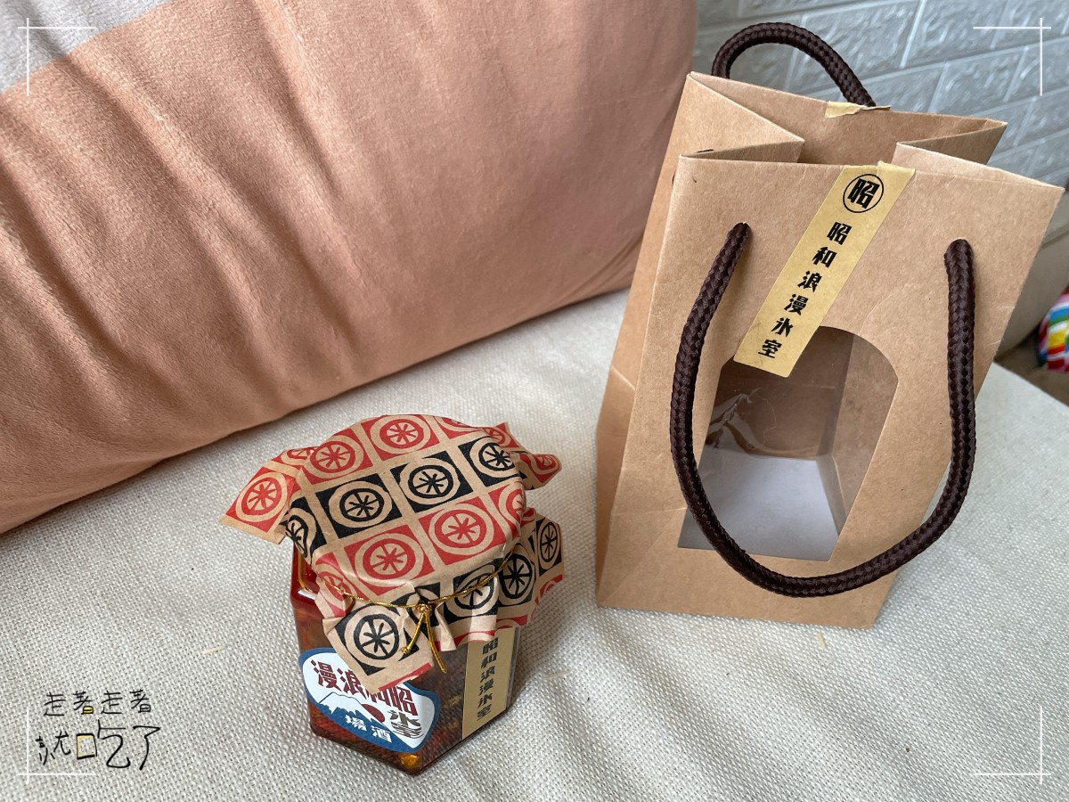一個紙袋裡面裝著辣椒醬的罐子,罐子頂端用裝飾用的紙包著,再綁上麻繩,整個包裝看起來有著蠻高的質量。辣椒主要成分有豆瓣、辣椒切片跟小魚乾,