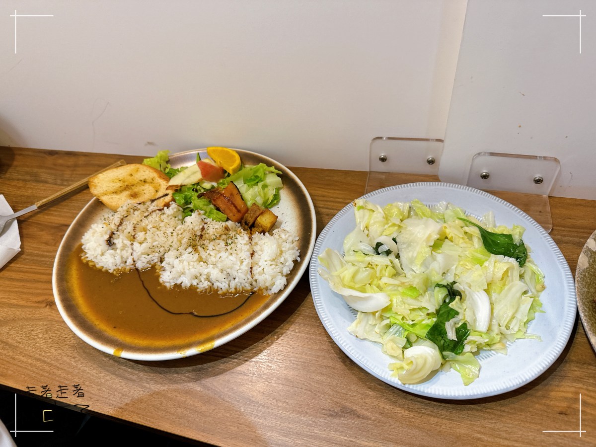 有一個飯盤,盤上面有麵包青菜生菜跟一些水果咖喱醬是冷的,沒有溫度,很香不會膩